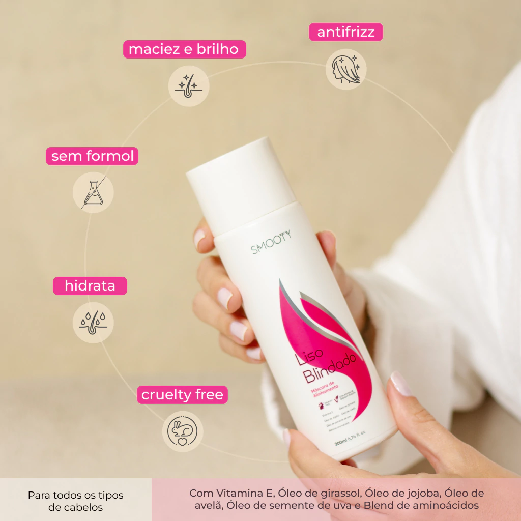 Transforme seu ritual de beleza com Liso Blindado Smooty e exiba cabelos lisos, sedosos e protegidos todos os dias!
